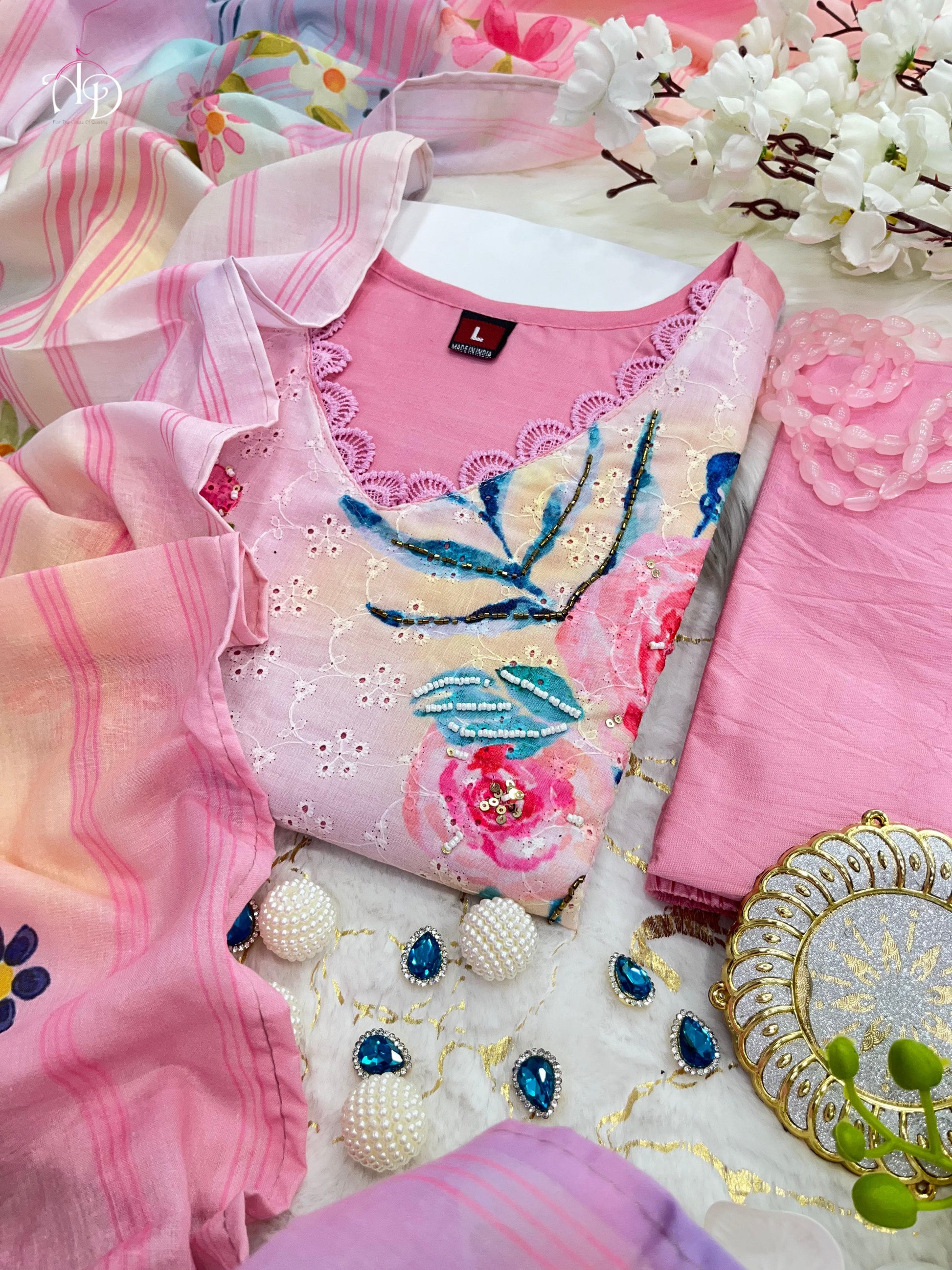 Experience comfort and style like never before with our newly launched linen suit which has a comfortable fit silhouette. The intricate hand embroidery and schiffli cutwork add elegance, while the beautiful floral summer prints exude sophistication.